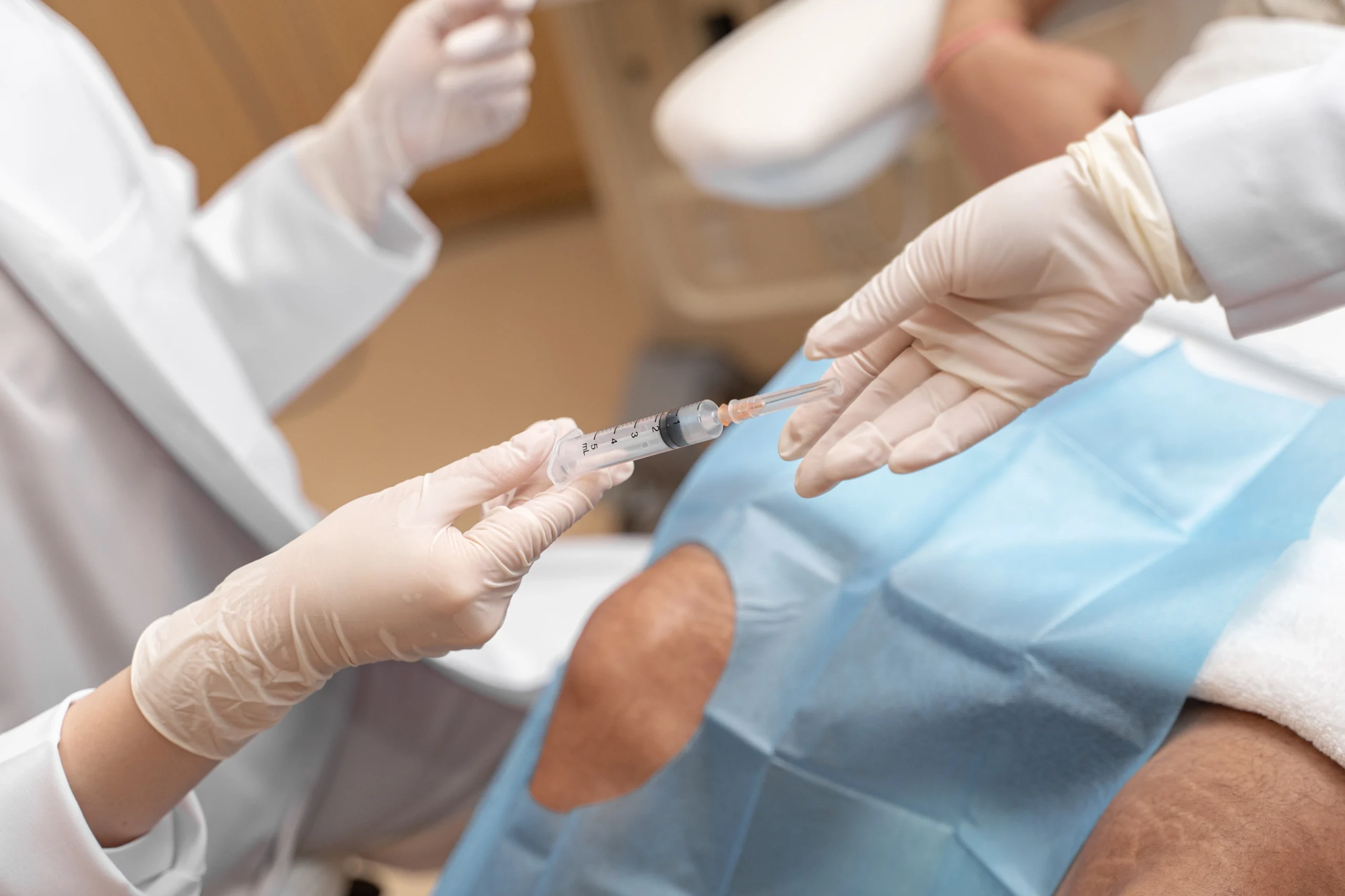 The injection itself is typically performed intra-articularly — directly into the knee joint — and takes a short time. Most patients go home the same day.